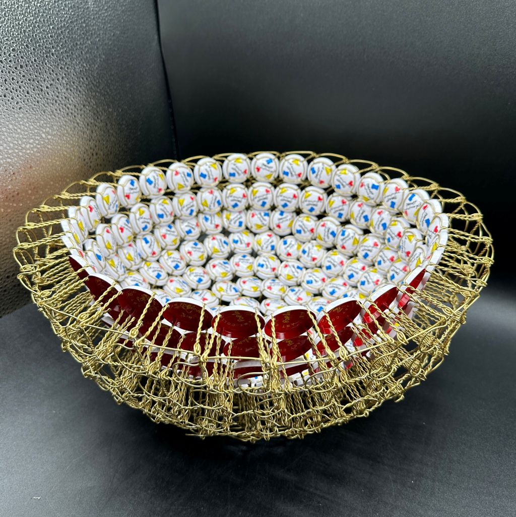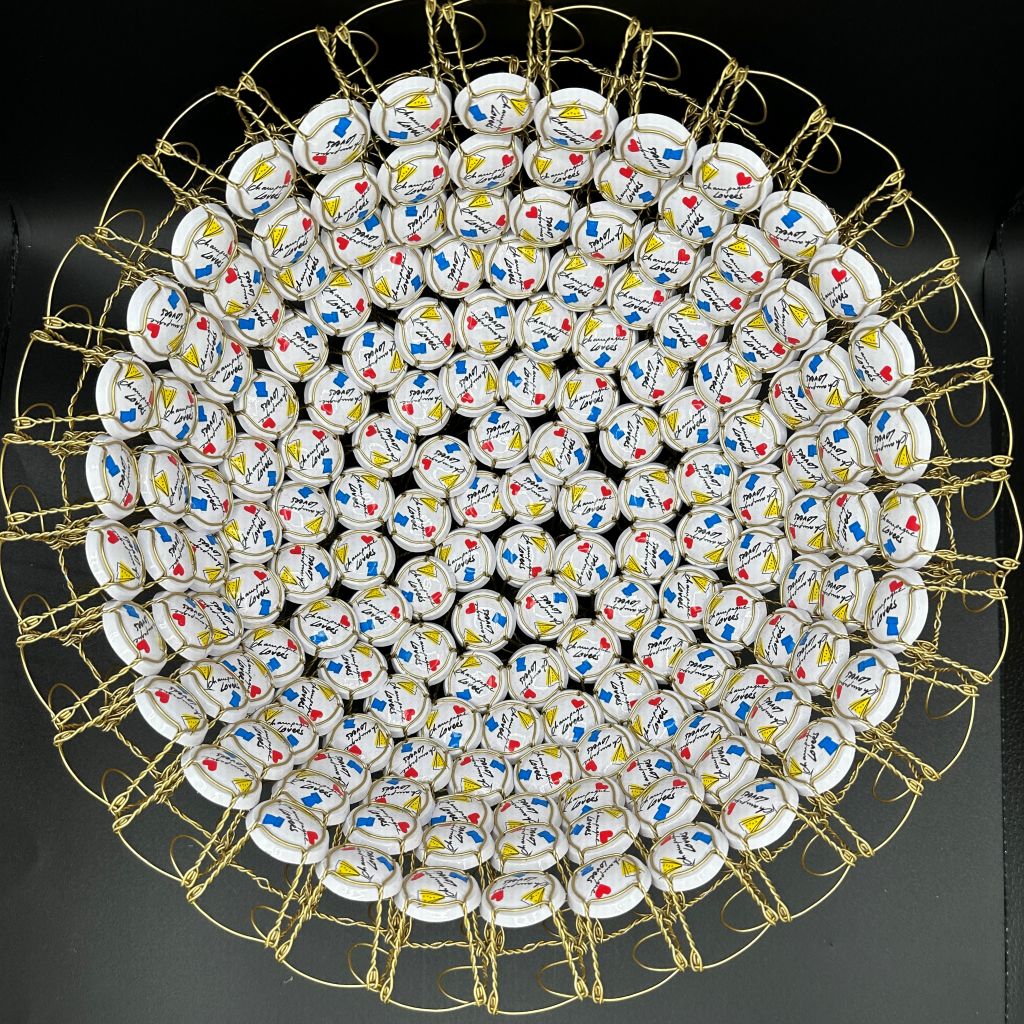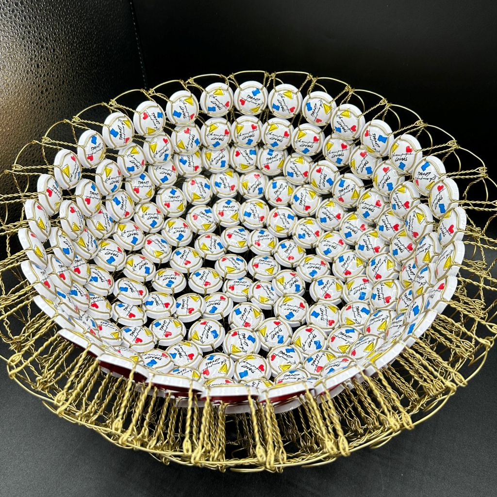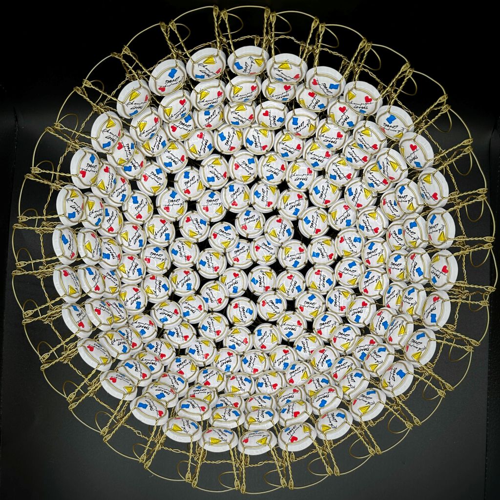 Chaque coupe est une pièce unique, fruit d’un travail minutieux et d’un détournement créatif qui donne une seconde vie aux muselets. Plus qu’un objet décoratif, elle devient une sculpture symbolique, célébrant à la fois l’art, l’amour et l’effervescence.