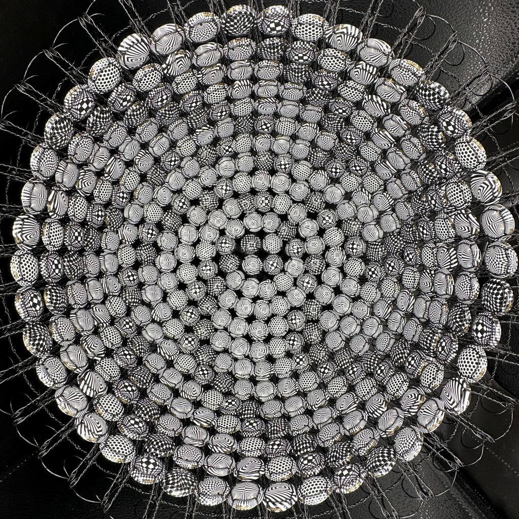 La Coupe en Muselets de Champagne – ART COLLECTION « OP ART N°2 » – Version XL marque une nouvelle étape dans la série. Avec ses dimensions généreuses, cette pièce grand format affirme pleinement la puissance visuelle du noir et blanc, signature emblématique de la collection OP ART.