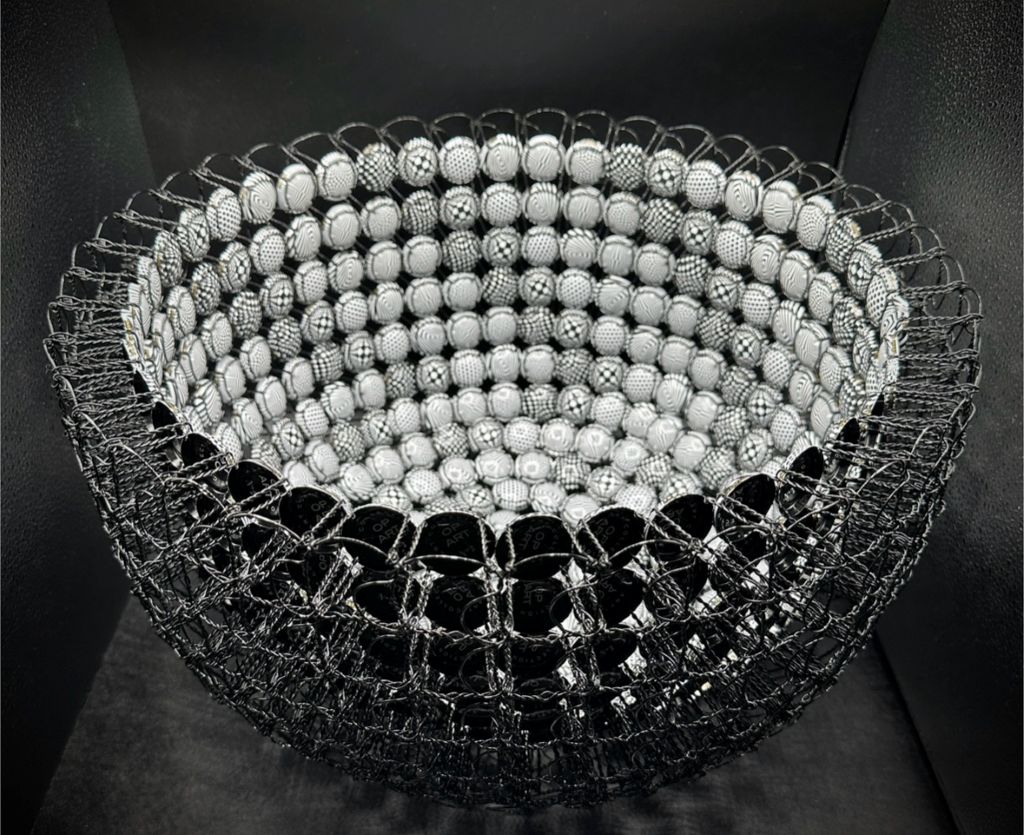 La Coupe en muselets de Champagne OP ART N°2 – Version XL est une pièce exceptionnelle en noir et blanc, réalisée à la main à partir de 375 muselets de Champagne. Une œuvre grand format au caractère fort, symbole d’une création contemporaine audacieuse et écoresponsable.