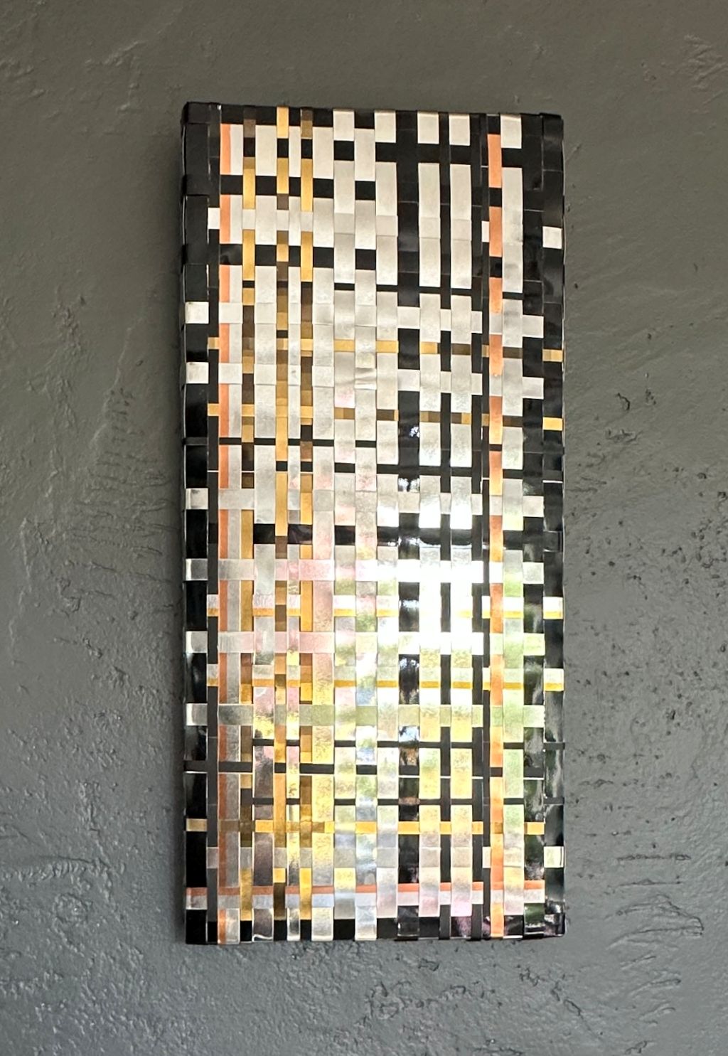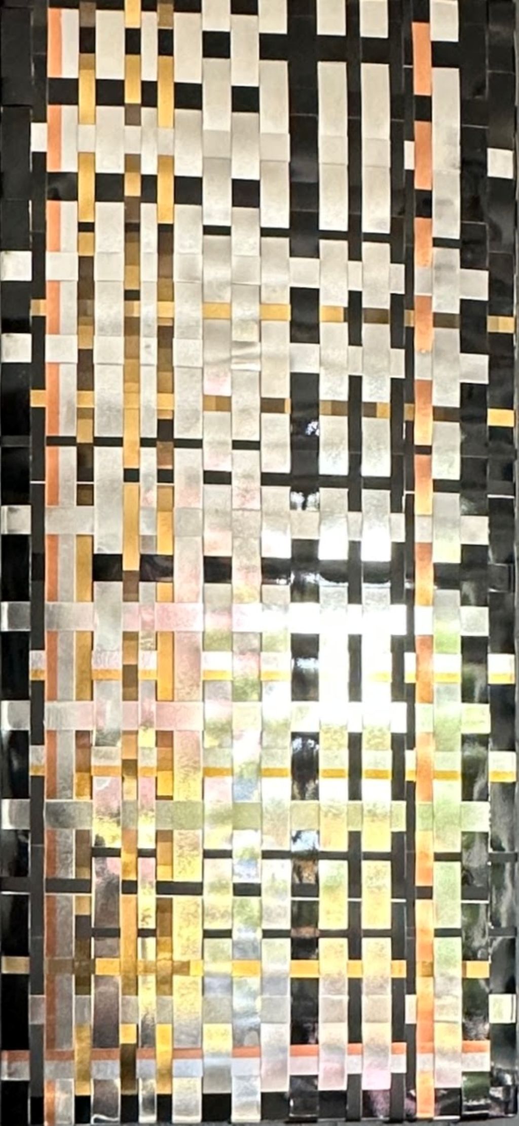 Matériaux : Bandes métalliques issues de la fabrication des capsules de champagne, tissées à la main sur support bois.